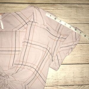 Great, preloved condition. Free People Windowpane Plaid Dress. Oversized. Short, cuffed sleeves. Deep V-Neck. Twist front, knotted detail at the V. Hi-Low hemline Shirt Dress. 100% rayon.