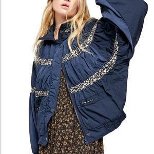 Let your style fly high. Retro-inspired bomber jacket from Free People features gathered tiers with a contrasting floral-print fabric and front pocket detailing.