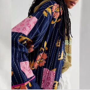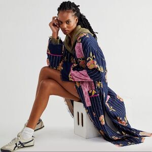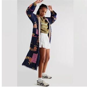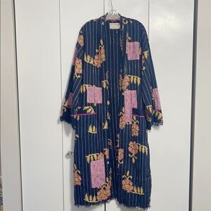 Casually cool and one-of-a-kind, this so cozy duster is featured in a shapeless silhouette and perfectly patchworked fabrication with side slit detailing and raw edges for a lived-in look.