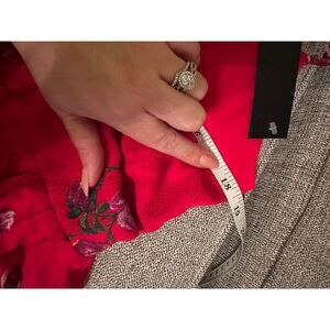 This is a new with tags Free Press, red floral midi dress with a tie front detail. The dress is made of a lightweight, woven fabric and has a relaxed fit. It features a V-neckline, adjustable spaghetti straps, and a flowy skirt. The dress is approximately 39 inches long and has a bust measurement of 36 inches. The dress is in excellent condition and has no visible imperfections.