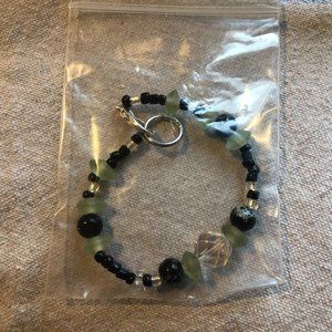 This handmade black and green bracelet alternates free-spirited translucent jade-like glass beads with the introverted sensibilities of black marbled beads. This handmade bracelet measures 8 1/4 inches long with a lobster clasp. Use it to remind the self of maintaining a balance between expansiveness and simplification. Please measure wrist before purchase.