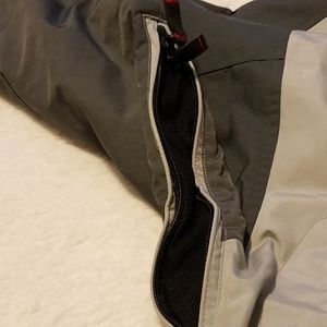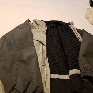 Size is M.Great snow boarding or skiing jacket by Freeworld. Light gray and dark gray colors. Back has a tghtening adjustment. Interior pocket is large with velcor closing. Front closes with velcor and heavy zippper. 4 zipper pockets on front of jacket 2 at chest area, 2 at waist . 2 side vents at arms, zipper closng. Waterproof rating. Freeworld Battalion 712-76. 2000MM