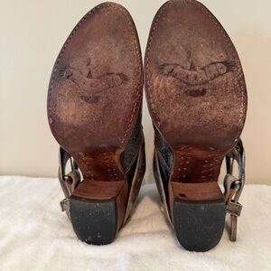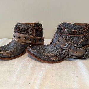 Freeboard Booties with textured leather upper, silver buckle and decorative leather strips. Boots have inside zippers. Size 10/41 European.