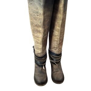 Freebird By Steven Aspen Long Brown Buckle/chains Leather Boho Women size 7. Rusted Antiqued Chains and Leather Straps along with Intentionally Distressed Leather Lend a Hard-Worn, Vintage-Inspired Western Motorcycle vibe. These boots are made to look worn and rustic. Some denim dye transfer on the inside leather also there is a flaw on one of the boots about a 3 inch drip (possibly can be cleaned) wear showing in soles. It all adds to the overall rustic rugged boho look. See pics for heel to toe and shaft measurements.