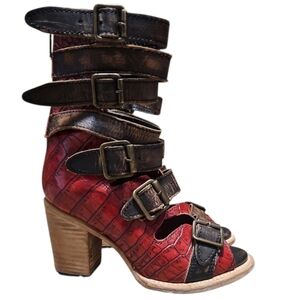Freebird by Steven Bond red croco strappy platform leather sandals. Step out in style with these chic red and brown strappy heeled sandals by Freebird. Perfect for any occasion, these shoes offer both comfort and elegance. Great paired with your favorite dress. Gently worn nice preloved condition.