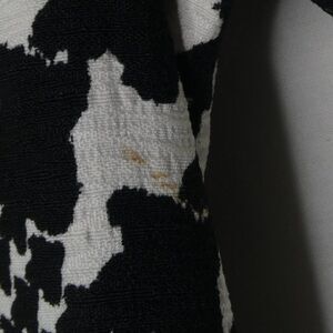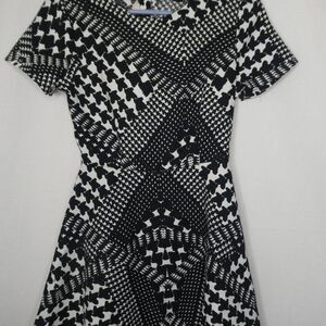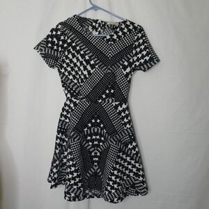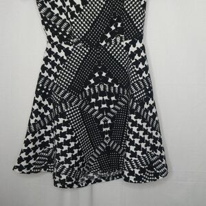 Adorable mini dress with two large cutouts in the back, buttons at the back of neck, and multiple houndstooth prints. Black and white. Fit and flare. Small mark under arm(pictured), but overall in excellent condition.