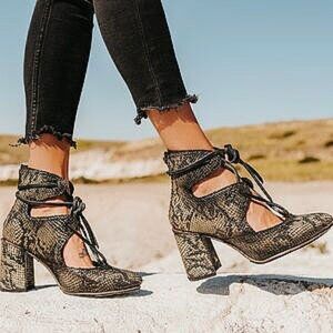• JOYCE includes a back brass zip closure, while its front leather lacing can be knotted or wrapped around the ankle