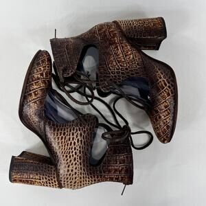Freebird By Steven Joyce Ankle Bootie Heels Brown Leather in a Snake / Croc Pattern Lace up style Backside Zippers