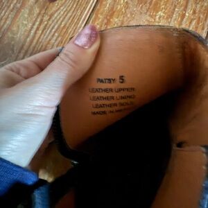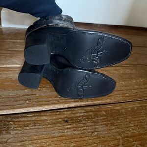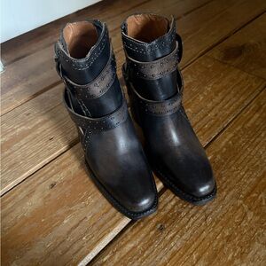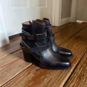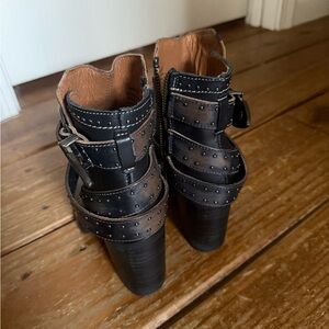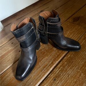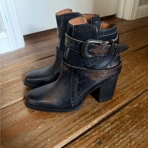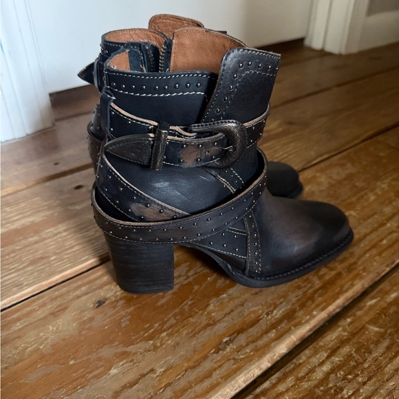 Gorgeous Freebird Patsy in a size 5. Brand new. These run big, I usually wear a 7 in Freebird closed toe boots. I thought these were a 6 when I bought them, but they still fit me. I’m a true 6.5. Id say these will comfortably fit a 6-6.5. Color is distressed black. 3” heel. Comes with a box and dusters.