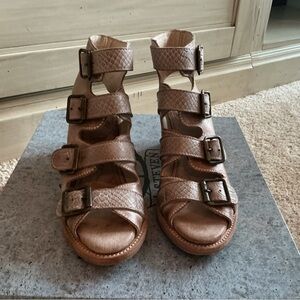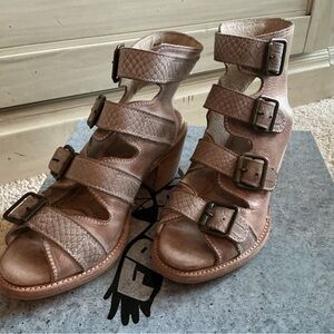 Stylish pinkish heeled boots with buckle accents. Perfect for adding flair to any outfit.