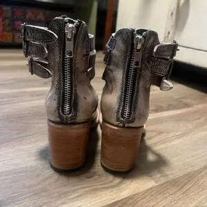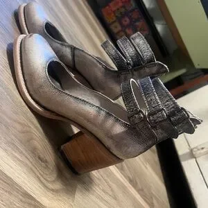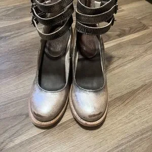 Freebird’s Randi is a unique take on the classic heeled Mary Jane! Designed with an open construction, this mid-heel shoe creates a clean feminine silhouette with its leather ankle straps and round toe. Finished with metal adjustable buckles and a back zip closure. Super comfortable and in great condition- signs of wear as pictured. This specific color has a lightly embossed snake print paired with a s shimmery pewter multi finish. This distressed multi color allows for it to be paired with both warm and cool toned outfits! Styling pictures will be included at the end😇 ‼️‼️NO LONGER SOLD ‼️‼️