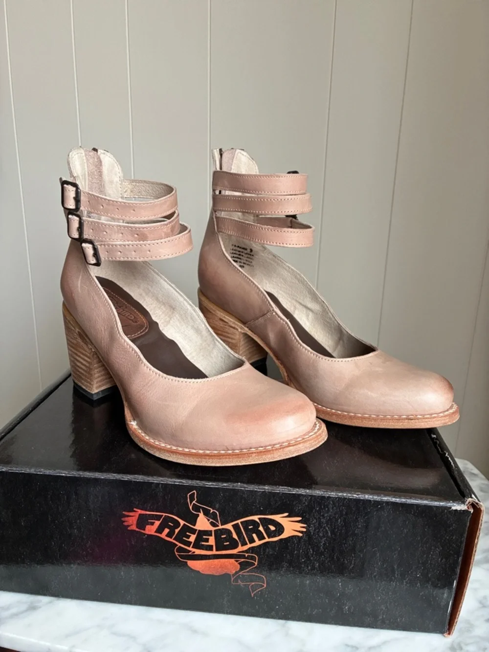 Worn a few times in excellent condition. There is a light scratch on the one you can see in picture. Size 9 color is blush. Comes in original box with dust bags.