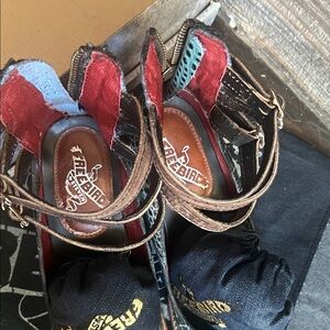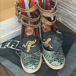 Elevate your look with Freebird's green croc-embossed heels. Features stylish brown straps and a sturdy block heel.