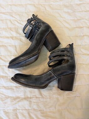 Simple, but never boring - FREEBIRD RANDI. Designed with an open construction, this mid-heel shoe creates a clean feminine silhouette with its leather ankle straps and round toe. Finished with metal adjustable buckles and a back zip closure. New without tags/box in the color Turquoise Croco. EUC size 9