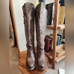 Freebird Whisper tall zip-up boots. Gently used in great condition. Distressed black is the color, but really these are more brown. A few small flaws as pictured. Shaft is 16" in back and 18" in front. Original box and Freebird's dust bags included.
