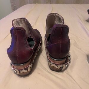 Stylish purple leather ankle boots featuring a unique chain detail. Perfect for adding a bold touch to any outfit. Very well loved! Marked low in price!