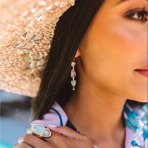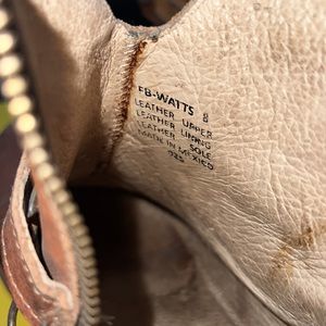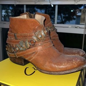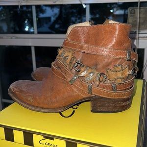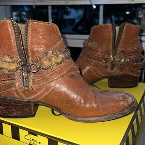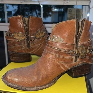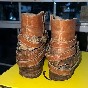 Distressed leather with fun straps and metal bird shaped chain. Cognac leather