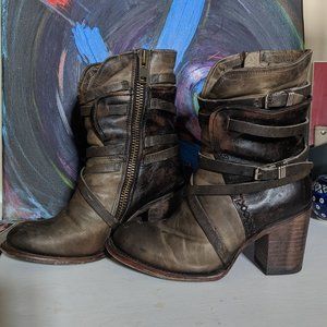 Only worn twice! This is the Baker boot by Freebird, in color Stone (basically grey and brown?). These babies are gorgeous and comfortable and still have that new shoe smell. They deserve a much better life than they'll get sitting in my closet. I tried to show photos of what wear they do have, but message if you'd like something specific I didn't include.