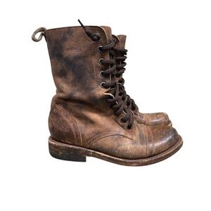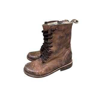 Stylish lace-up boots by Freebird. Rich brown leather. Durable and rugged design.