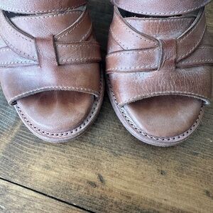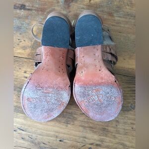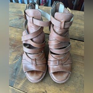 Stylish tan leather sandals with a strappy design. Distressed look. Features a sturdy block heel and buckle closure. Leather is super soft and these are well worn but Freebirds always have a long life! Feel free to make an offer.