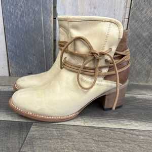 Stylish cream ankle boots with tan accents. Features wrap-around laces and a sturdy block heel. Perfect for casual wear.