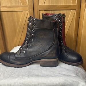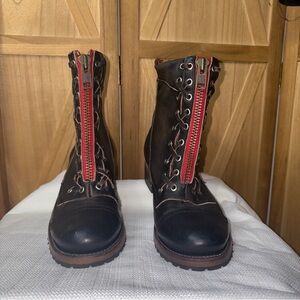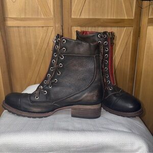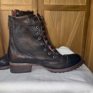 Rugged leather ankle boots. Distressed black with brown tones. Lace-up front and side zipper. This is a very sturdy leather bootie description says the leather is distressed, it leather lined, 12inch shaft circumference, 6.25 shaft height, 1.25 heel height with rubber tread sole, zipper works in front and back of boot, previously worn only a few times in excellent condition
