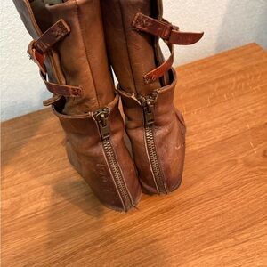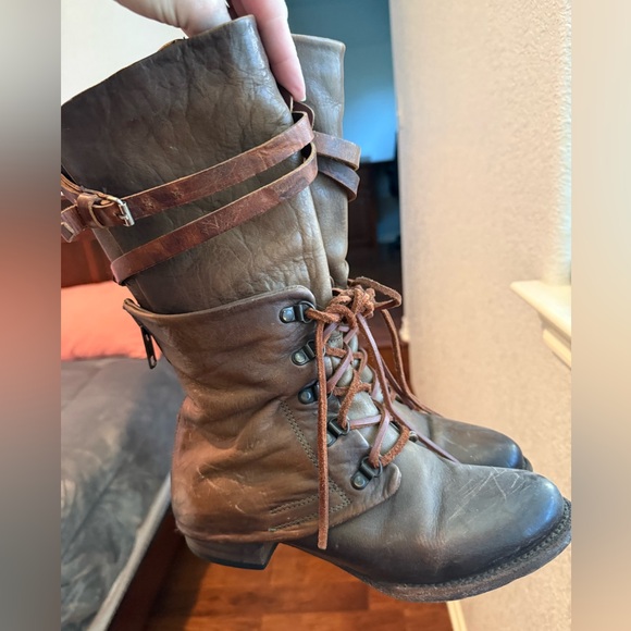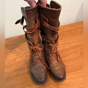 Rugged brown leather boots with lace-up front. Features buckle strap detail. Ideal for a bold, stylish look.