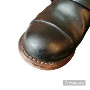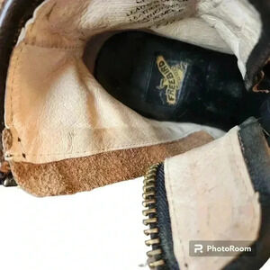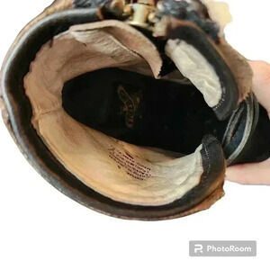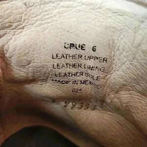 In excellent condition. See photos for markings on toes. Leather upper, lining, and sole. Distressed gold toned upper leather, black leather overlay, and red suede straps in back.