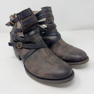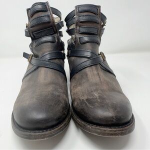 Excellent Pre-Owned Condition. Very little wear. Factory distressed leather ankle boots. Adjustable buckle straps. Zipper on back heel.