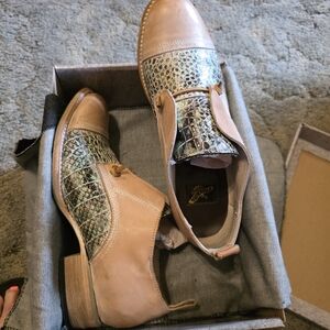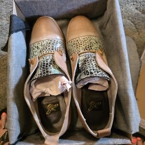 Chic loafers with a tan leather base and turquoise textured accents. Perfect for casual elegance. Excellent condition, still in box with denim wrap.