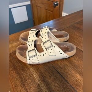 Chic white sandals with studded details. Double buckle design. Comfortable and stylish.