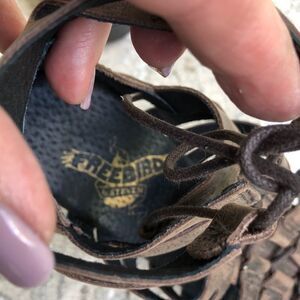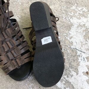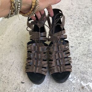 These are distressed brown strapy sandals as you see from the pictures are in new condition. The heel height is 4 inches and the platform is 1 inch. And tie around the ankles