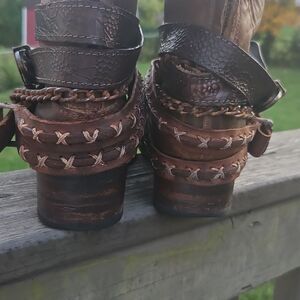 Freebird by Steven boots, Knox boots, distressed leather boots, tall western boots, boho cowgirl boots, rustic leather, buckle boots, wrap strap boots, festival style, vintage look, women’s size 10, Freebird Knox brown