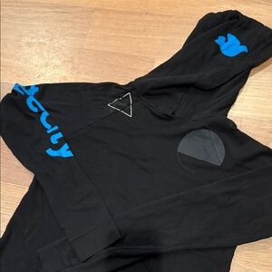 Chic black hoodie with striking blue graphics. Comfortable and stylish for any casual occasion.