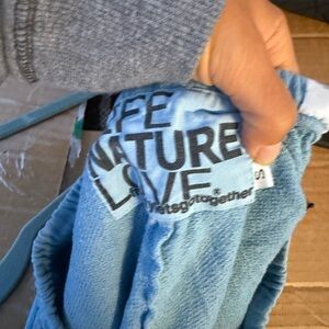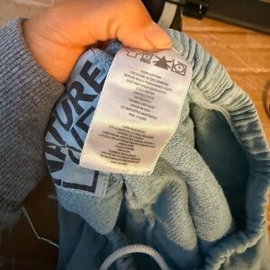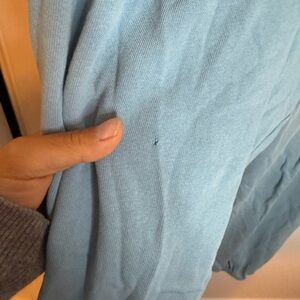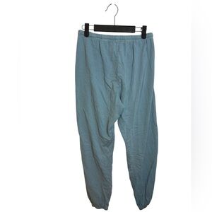 Pre owned overall great condition. The only flaw is a tiny holy on the right leg (pictured). These are a pale baby blue pair of sweatpants. The true color is reflected in the second photo. My lighting made the first photo look more blue than they actually are. WOMENS size small.