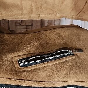 Stay warm and stylish with this chic tan shearling jacket. Perfect for any occasion. Pre-owned
