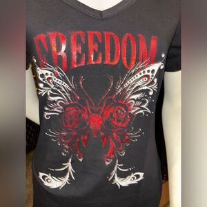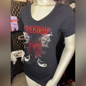 Black V-Neck Tee with Freedom wings and roses graphic.