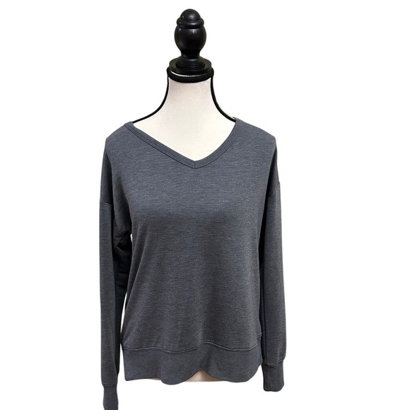 Keywords: Freely, Gray Top, Long Sleeve, V Neck, Ladder Back, Cutout Top, Casual Top, Women's Top, Sweatshirt, Athleisure, Comfortable Top, Everyday Top, Relaxed Fit