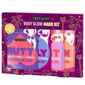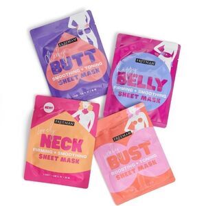 Target skin concerns on your body with this mask kit from Freeman. glow. PRODUCT DETAILS Cheeky Butt Smoothing + Toning Sheet Mask (1 pair 1.35oz), Happy Belly Firming + Smoothing Sheet Mask (1 sheet 1.18oz), Perky Bust Boosting + Toning Sheet Mask (1 pair 1oz), Lovely neck Firming + Smoothing Sheet Mask (0.68oz) Paraben-free, Phthalate-free, Sulfate-free, BPA-free, Talc-free, Cruelty-free, Vegan friendly, Gluten free, Latex free, Oil free