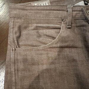 Freenote Cloth 13oz brown selvedge denim in Wilkes Western cut. In very good condition. Never laundered.