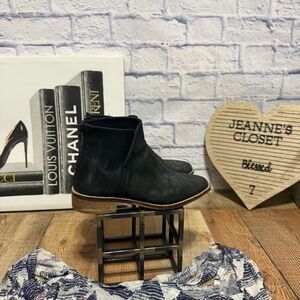 Free people black distressed leather century flat stacked heel boot in size 36. Leather pointed toe ankle boot featuring a wrapped detail at the ankle.