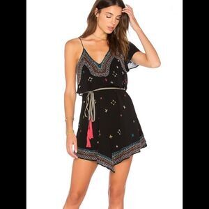 Steal some glances in this bohemian beauty by Free People. A flowy mini dress with stunning embroidered detail, it keeps things interesting with a single-sleeve design that gives way to a woven waist belt and a pointed hem.. Self & Lining: 100% rayon. Hand wash cold. Fully lined. Flounce bodice overlay. Waist tie with bead and tassel accents. Embroidered detail throughout. Revolve
