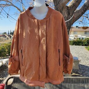 Excellent pre-loved condition free people jacket color orange pink, like peach color. size Medium. some sign of wear visible and shown in the photos. please see photos.