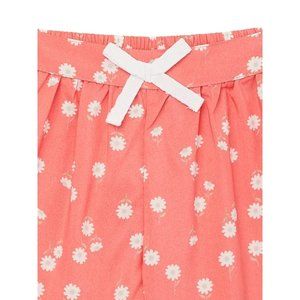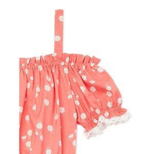 This girls’ set features a short sleeve top with a cold shoulder design and wide leg, cropped pants with matching prints. The finishing touch—an adorable hair accessory to complete her style.