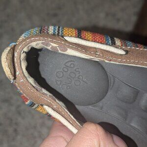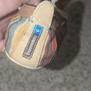Comfy and casual Freewaters boho striped flats with a colorful woven design. Made with canvas and faux leather details. Easy slips on style, lightweight, and perfect for everyday wear, festival, or travel.