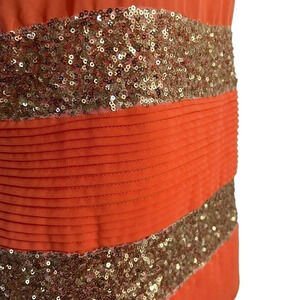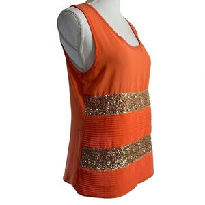 Freeway Blouse Medium Orange Gold Sequin Striped Sheer Tank Top Pleated Pullover