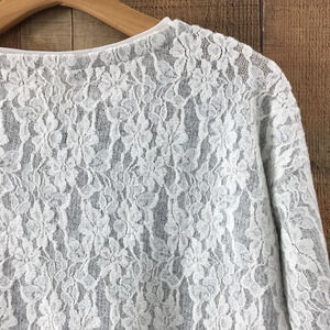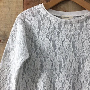 Freeway White Gray Lace Long Sleeve Blouse. Layered look; semi sheer. 60% Polyester, 30% Acrylic, 10% Cotton. Womens size Medium. Pre-owned Condition- no flaws, no rips, stains, or holes.