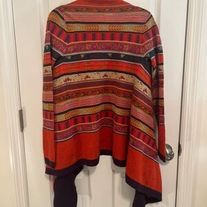 Vibrant poncho with bold stripes. Features a mix of red, orange, and purple hues. Ideal for a stylish, layered look.