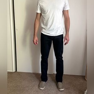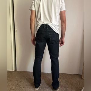 33x32 These say “Skinny”, but they fit more like “Slim”. Worn a couple of times. Model: 6’1”, 185 lbs.