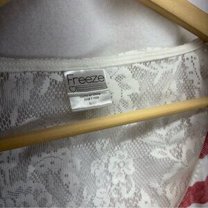 Embrace a relaxed style with the Freeze crop tank top, featuring a blue and white color scheme. This top offers a comfortable fit with its tank top sleeves and casual design, perfect for laid-back days. The semi-sheer fabric adds a touch of breezy elegance to your wardrobe. Pit to pit is 19” wide. Length is 23” long.